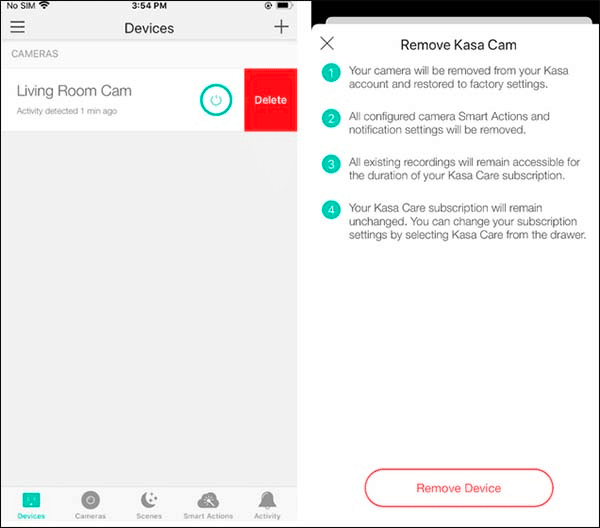To reset the Kasa camera using the Kasa Smart app, start by launching it on your phone. You should see the “Devices” page and, in it, locate your camera. Swipe left on the camera you want to reset and click “Delete.”