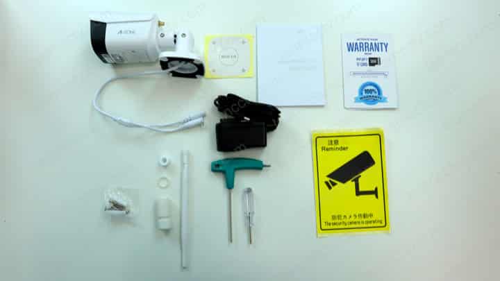 The box brings the camera, the wireless antenna, a power supply, connectors, screws, templates and tools for installation, stickers, and documents such as the camera's user guide and product warranty.
